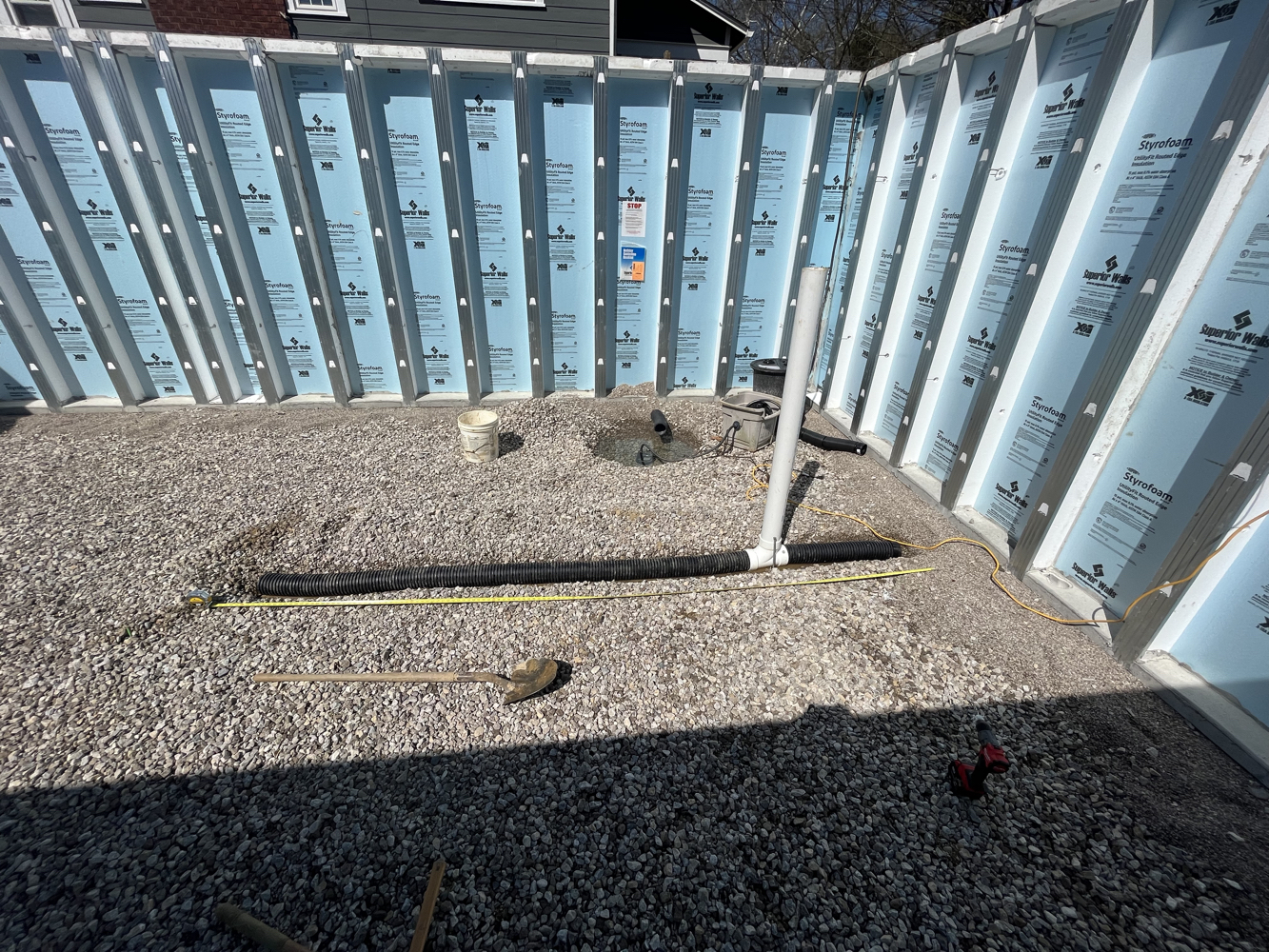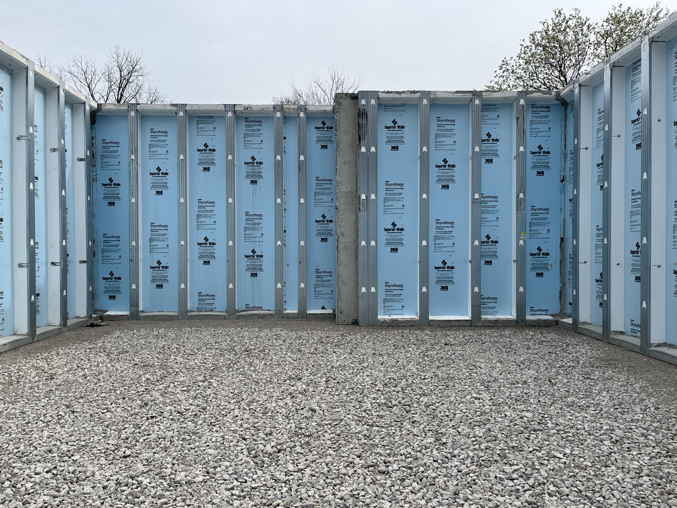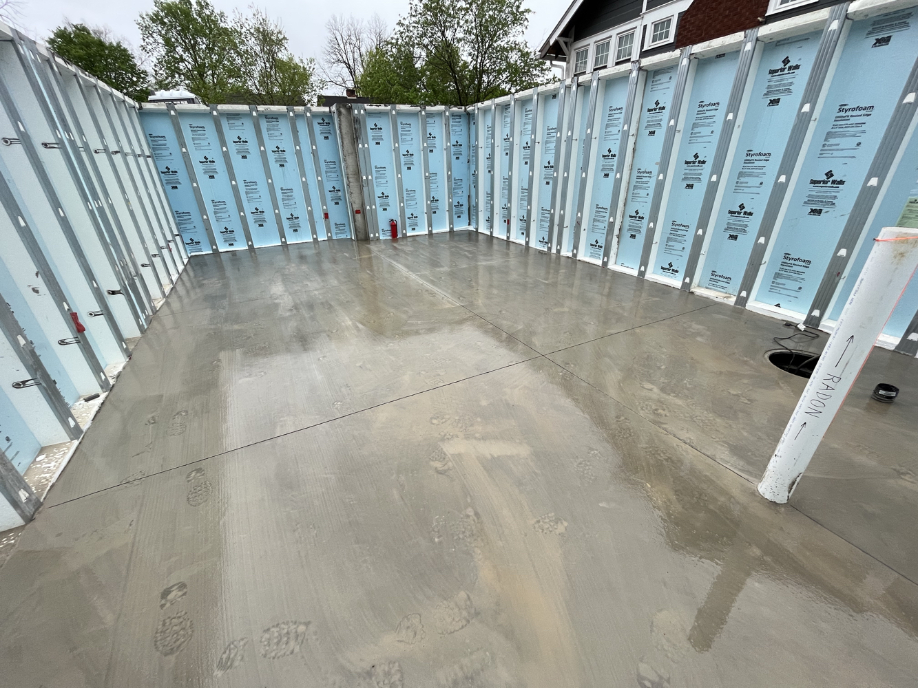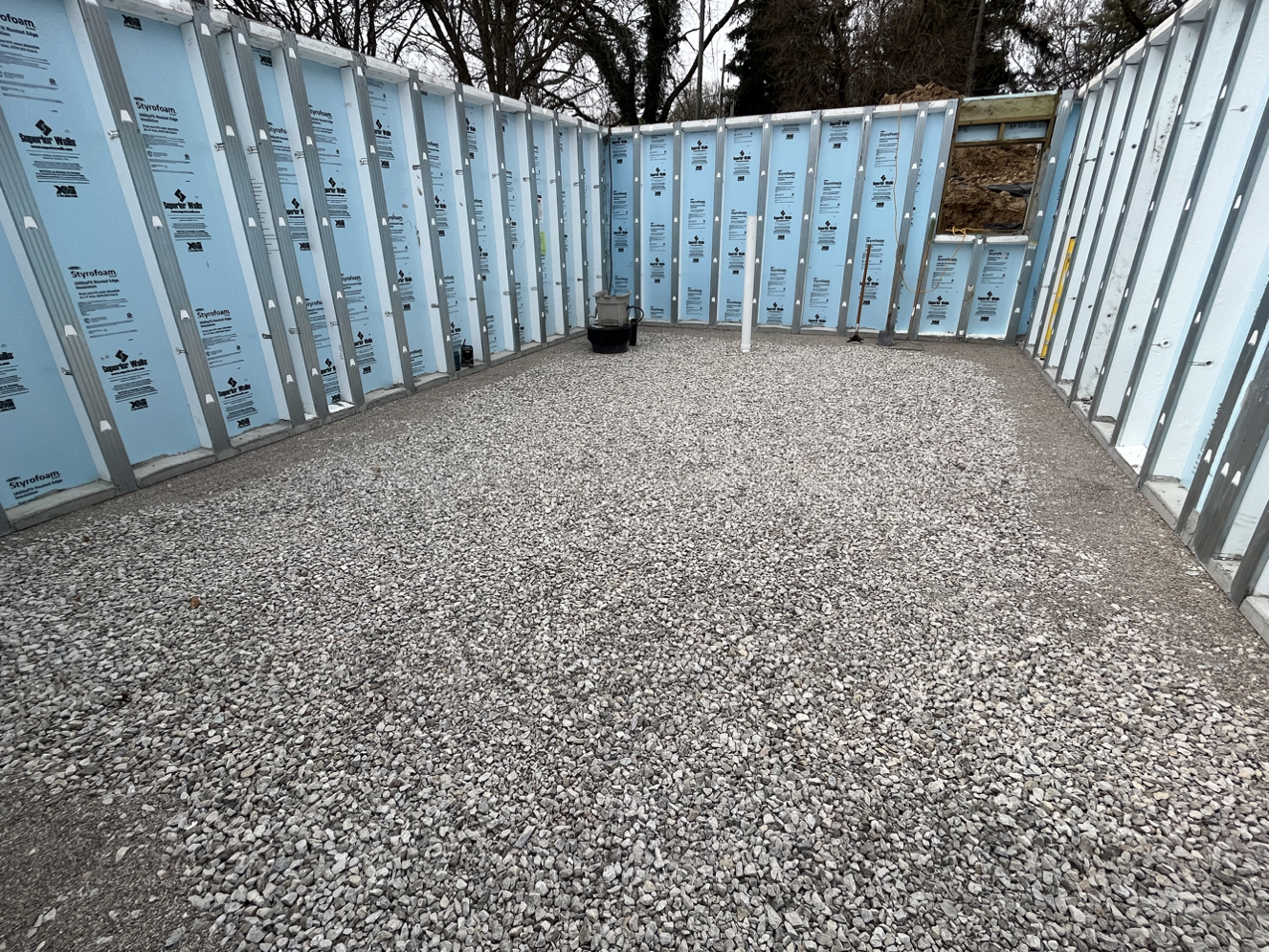 The hole was dug and crushed stone was placed as footing, drainage, and radon venting. Pre-fabricated, insulated concrete panels were craned in to create a foundation and basement.