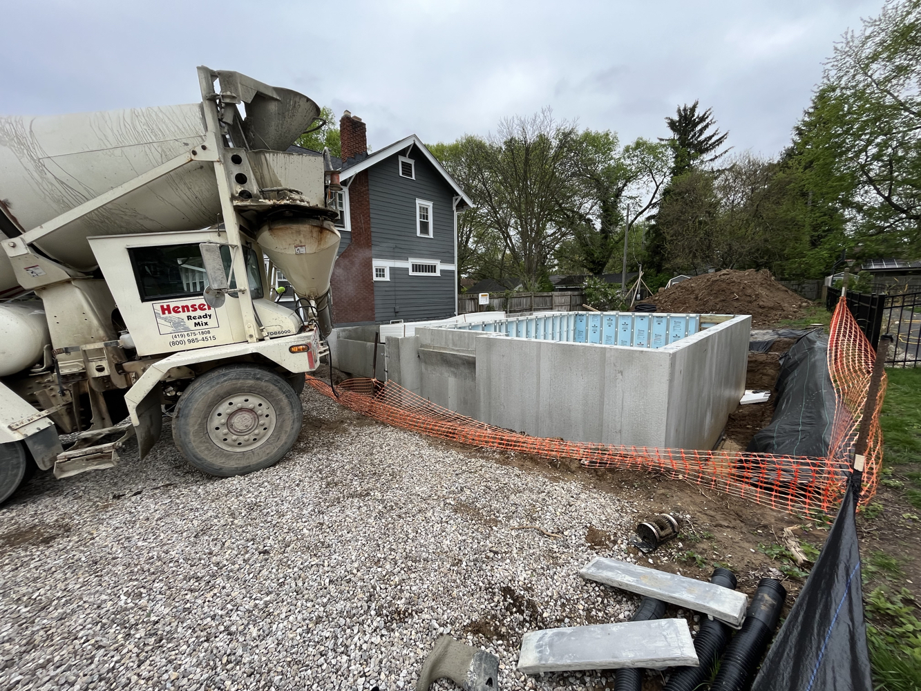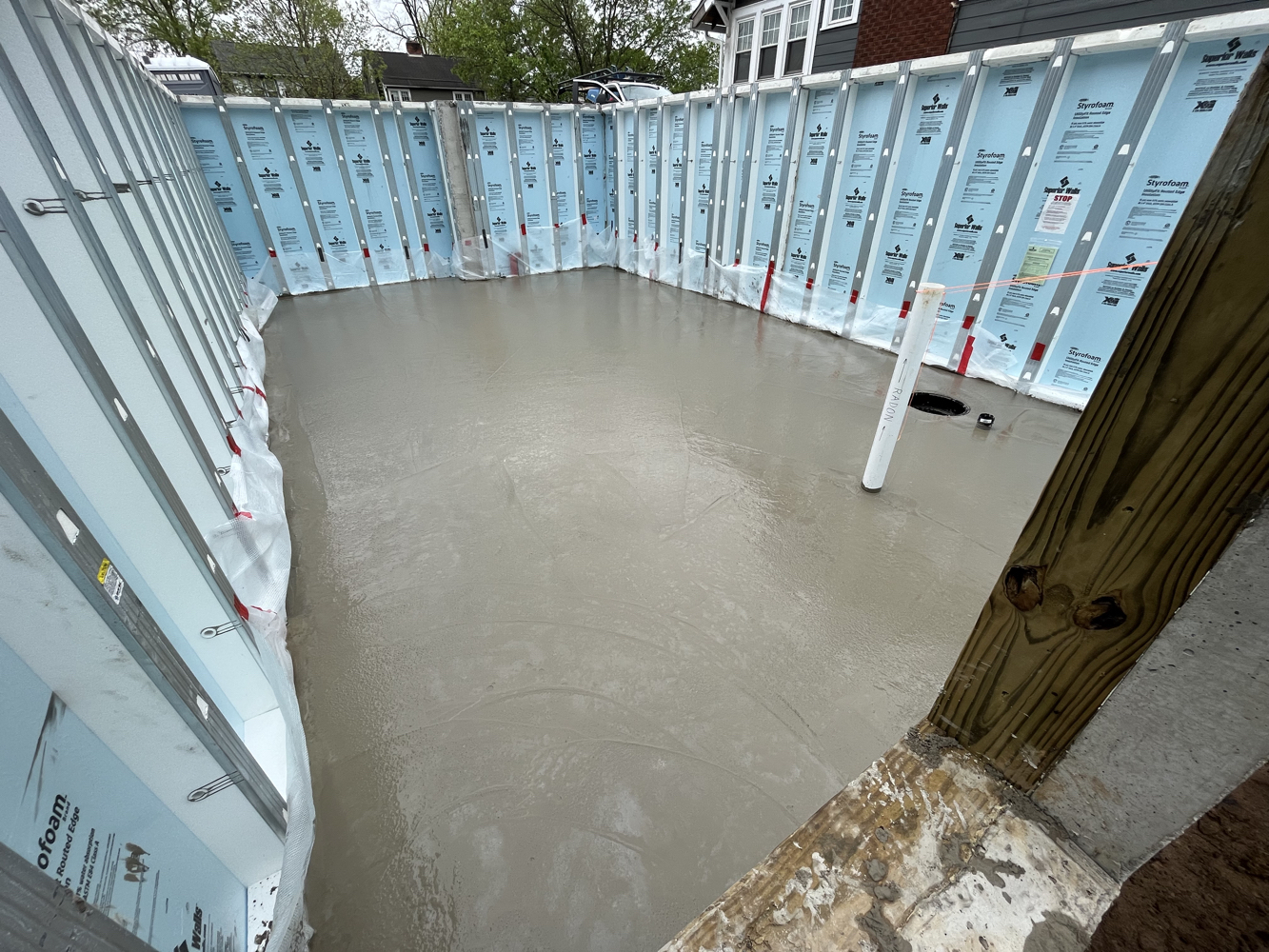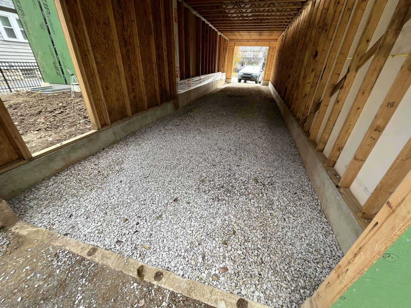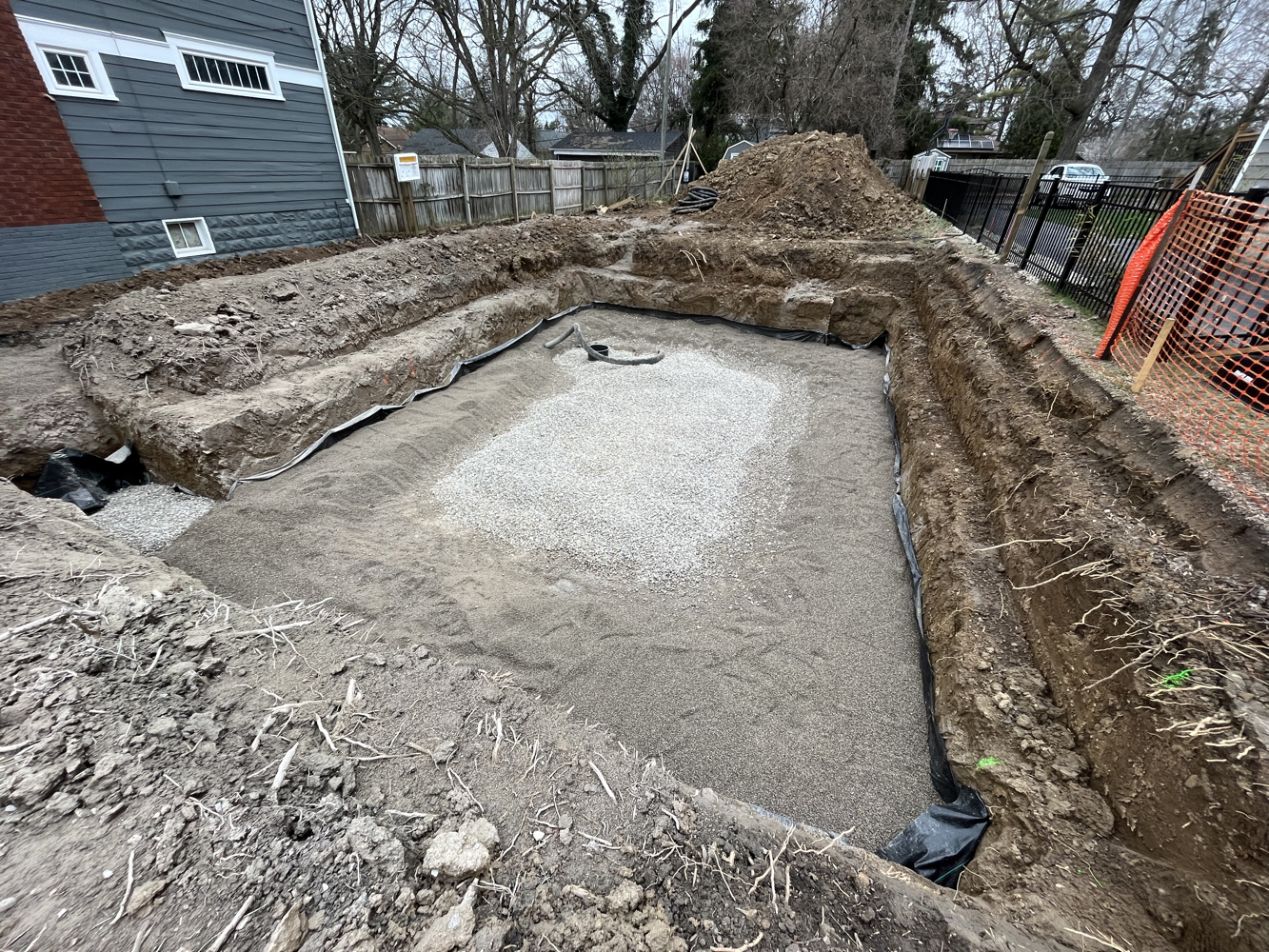 The hole was dug and crushed stone was placed as footing, drainage, and radon venting. Pre-fabricated, insulated concrete panels were craned in to create a foundation and basement.