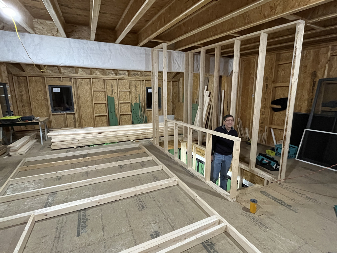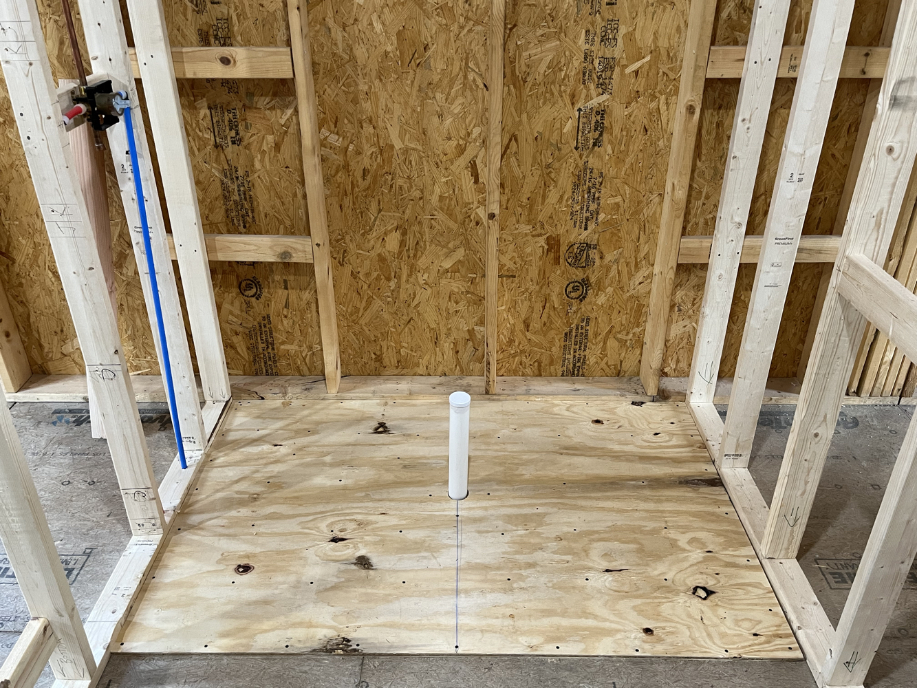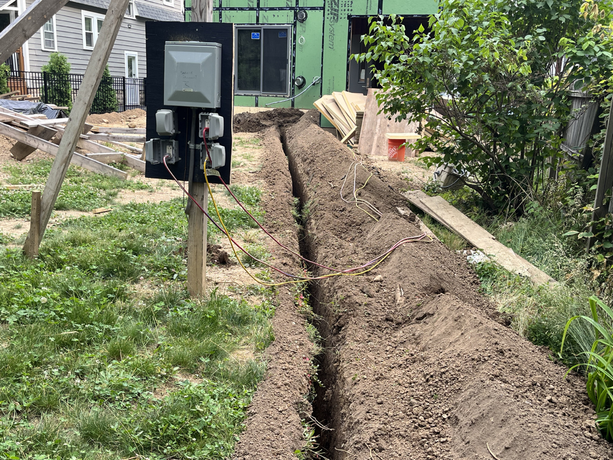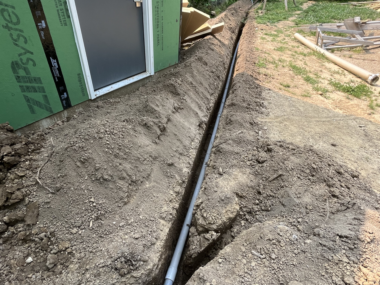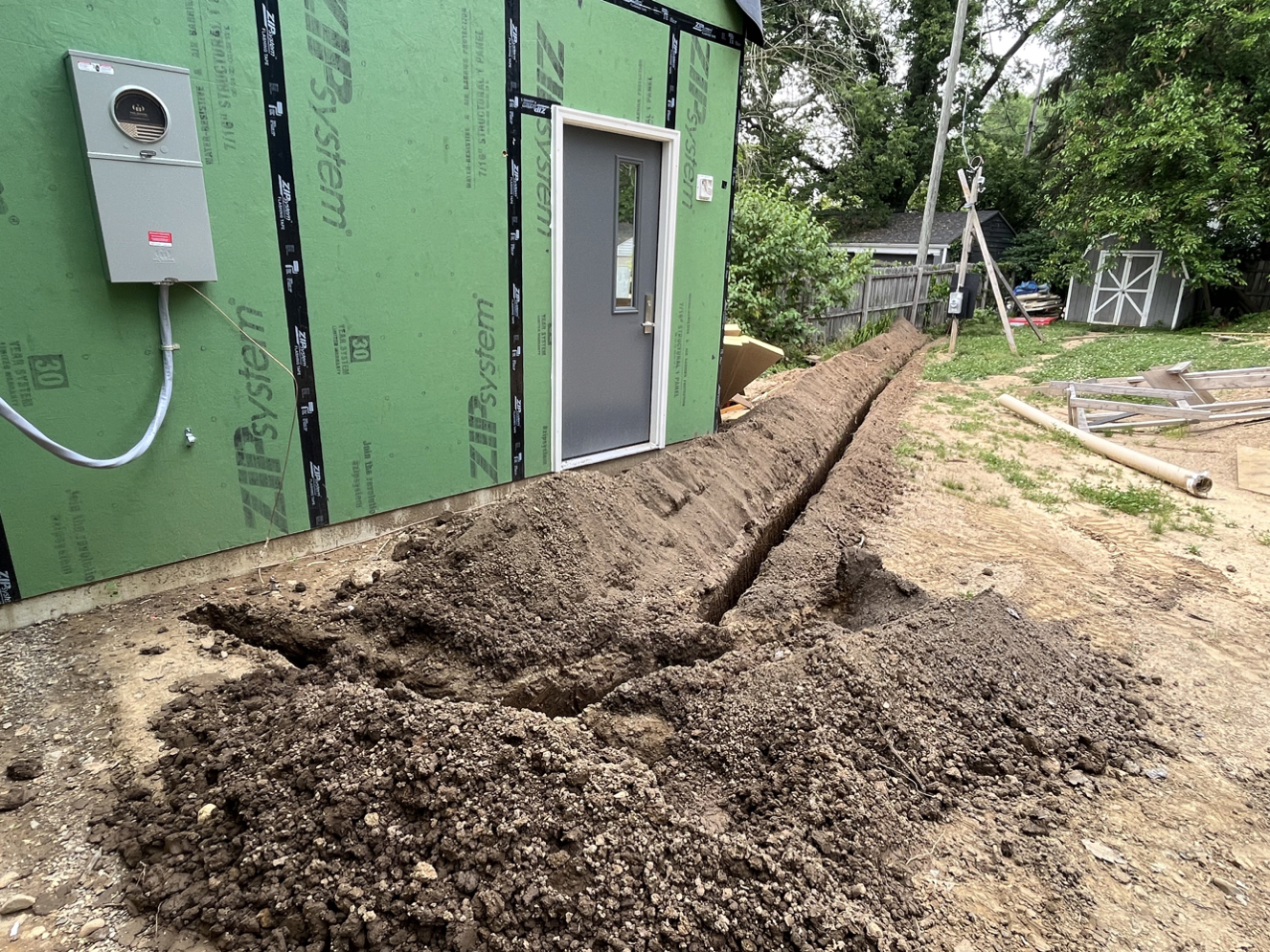 These trades were subcontracted, mostly. I did dig the underground electrical service entry trench with a friend of mine. Here you can see the all-in-one “magic box” HVAC unit I’m using for heating, cooling, fresh air ventilation, heat recovery, and humidity tempering. I got the shower pan ready for rough inspection, and I’ll be doing the tile work myself.