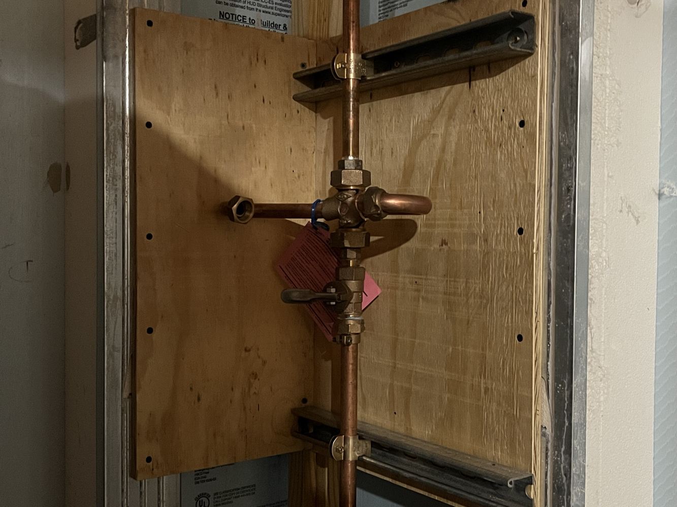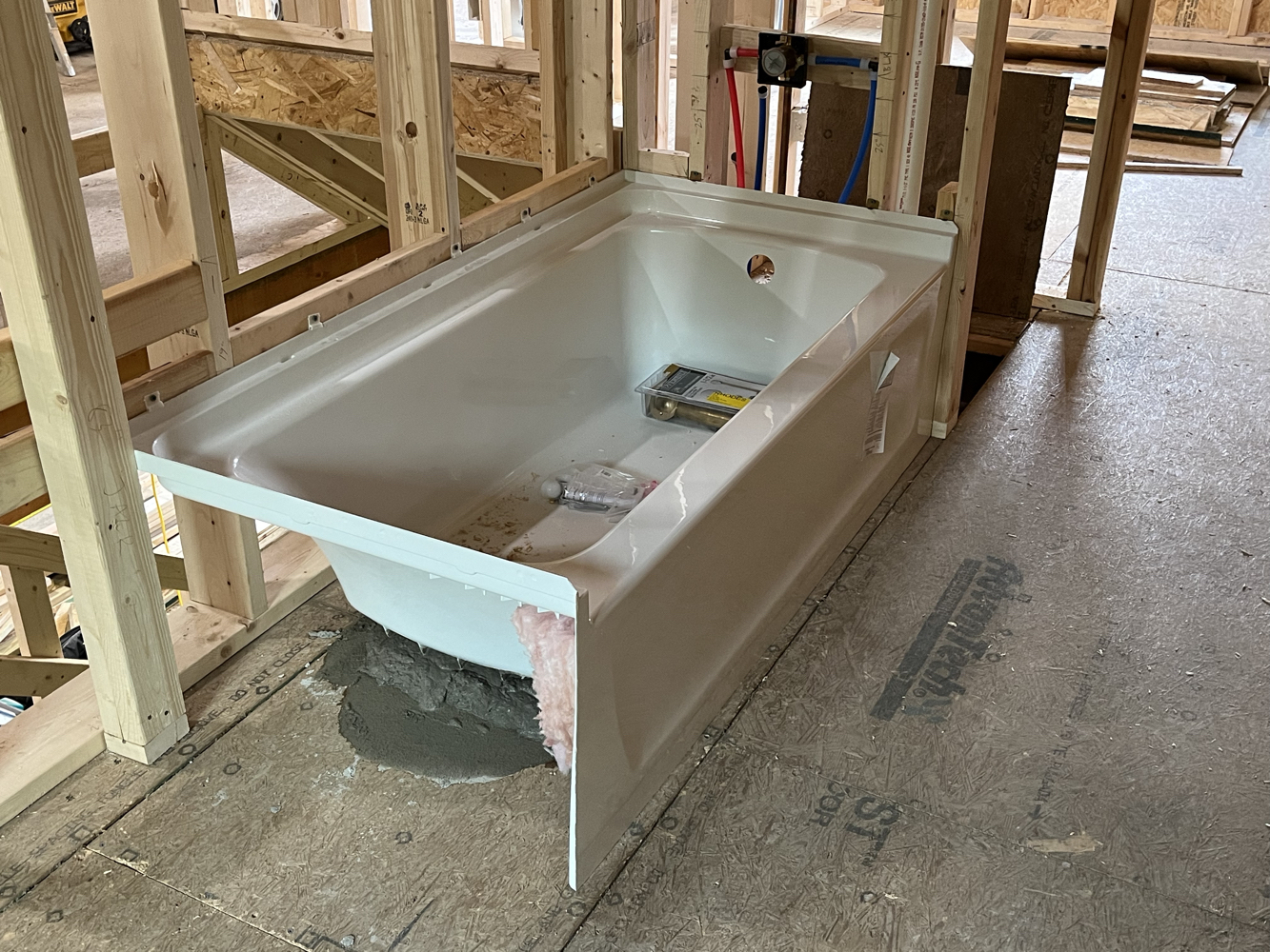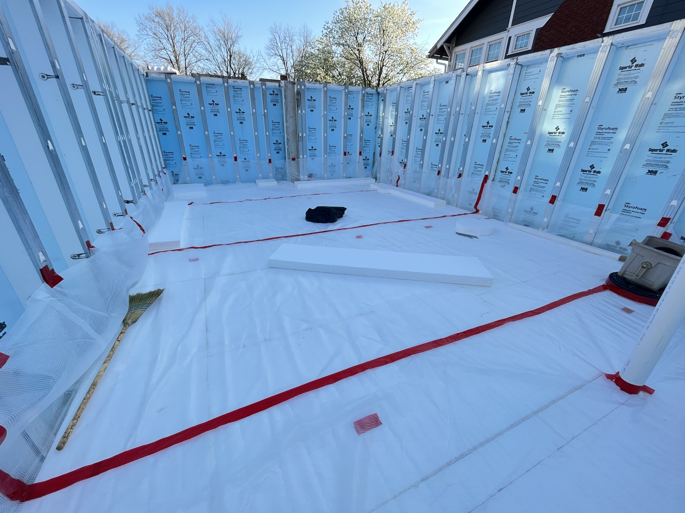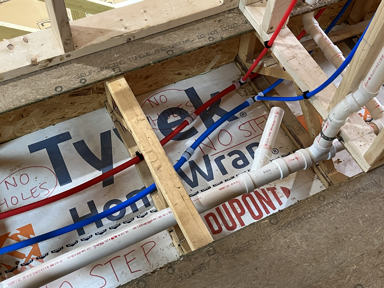 These trades were subcontracted, mostly. I did dig the underground electrical service entry trench with a friend of mine. Here you can see the all-in-one “magic box” HVAC unit I’m using for heating, cooling, fresh air ventilation, heat recovery, and humidity tempering. I got the shower pan ready for rough inspection, and I’ll be doing the tile work myself.